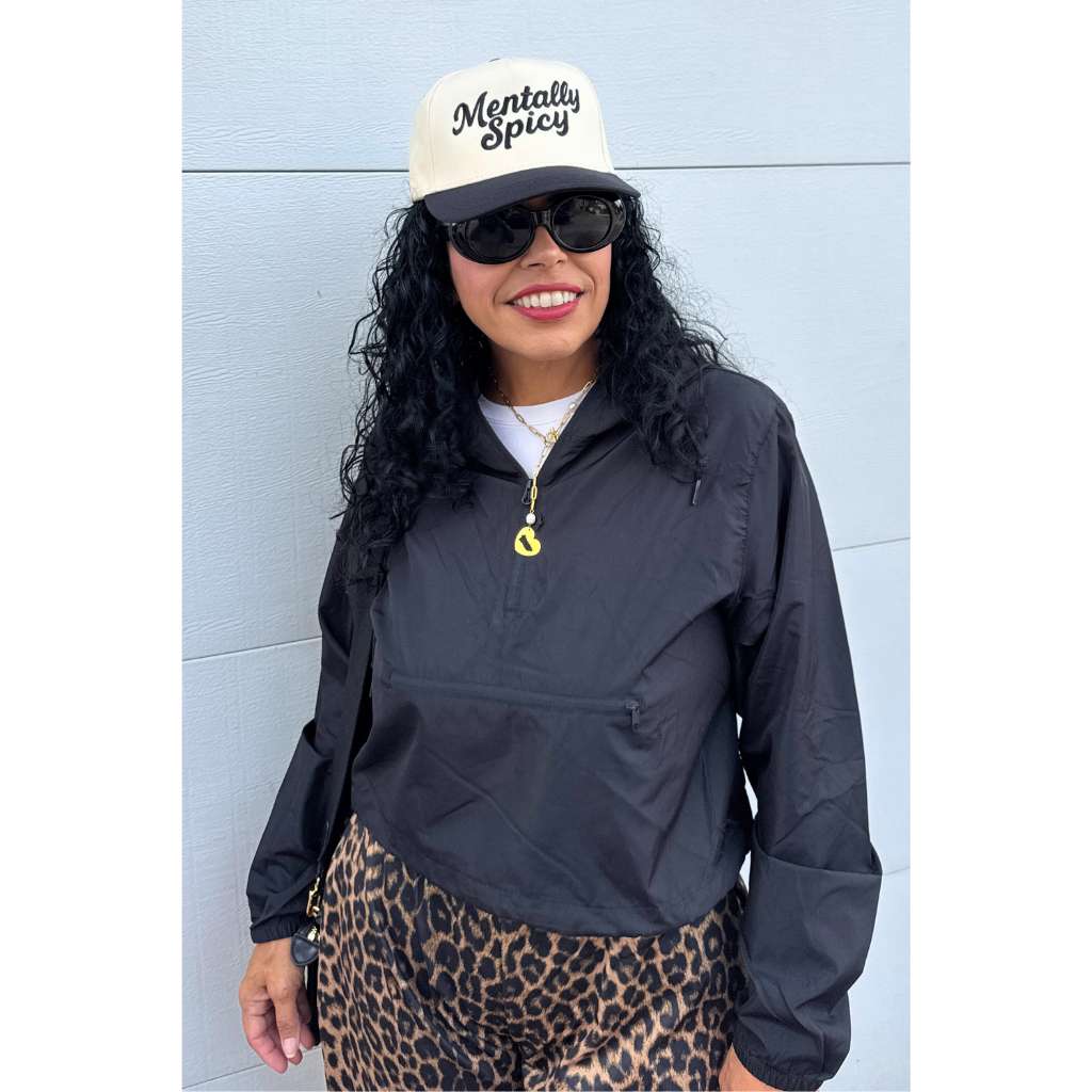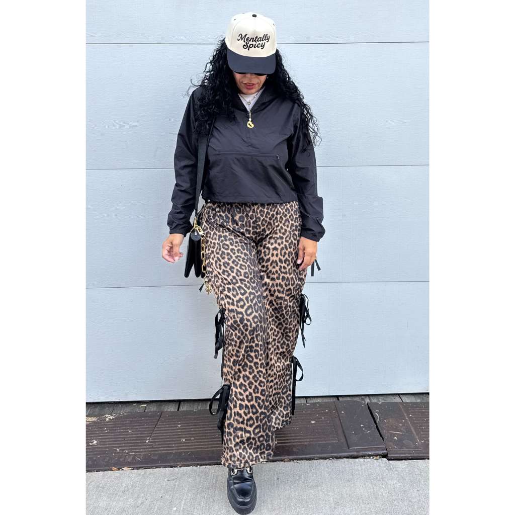 I styled the Mentally Spicy Embroidered Hat with leopard print pants, a black windbreaker, and chunky loafers — giving effortless confidence with a side of sass. It’s the kind of look that makes you feel unstoppable (even if you’re running late to life).